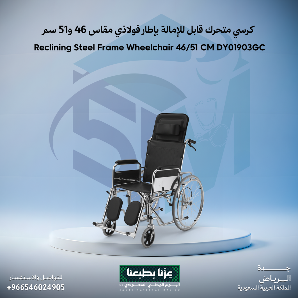 كرسي متحرك قابل للإمالة بإطار فولاذي متين متوفر بمقاسي 46 و51 سم، مصمم لتوفير راحة قصوى ودعم طبي متكامل.