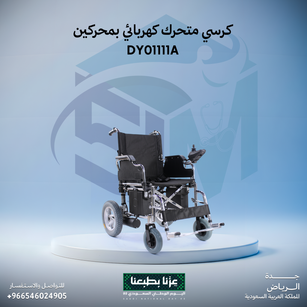 كرسي متحرك كهربائي مزود بمحركين قويين يوفر قوة دفع عالية وثبات ممتاز أثناء الاستخدام.