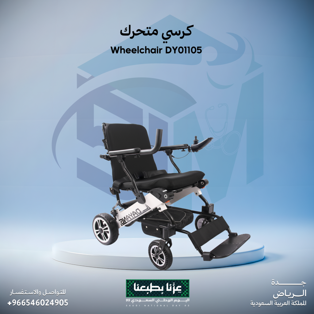 كرسي متحرك كهربائي DY01105 مصمم ليناسب احتياجات التنقل اليومية بسهولة وراحة.